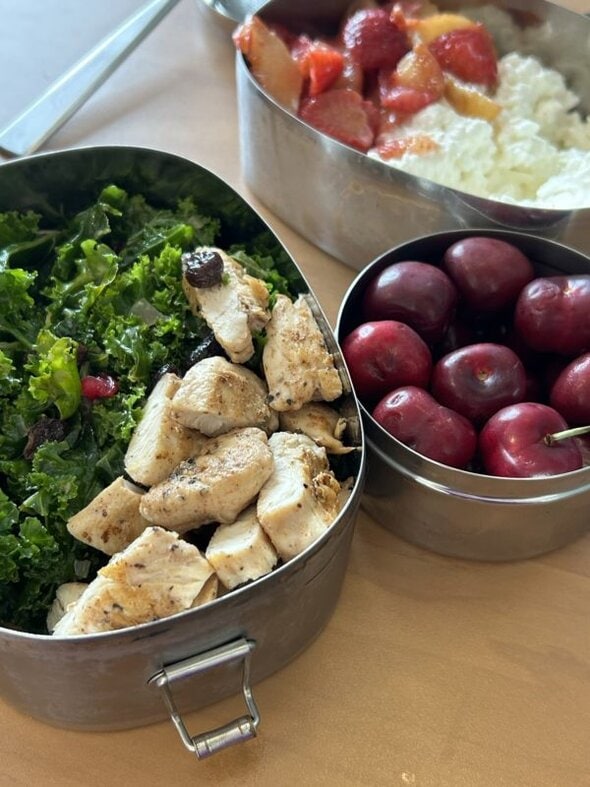 - packed lunches of fruit, cottage cheese, a salad with a protein (chicken or shrimp), and chocolate