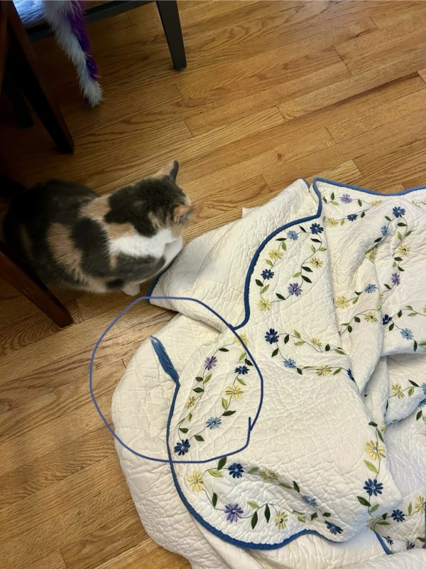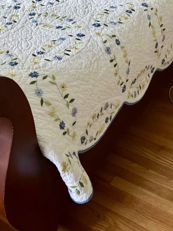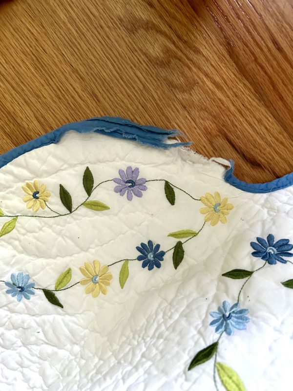 Hello! Wonderful mending, yet I would have approached it in a completely different manner. I don’t know if you know about a quilter’s “humility block.” Since it’s said that only God is able to make everything perfect, quilters often knowingly (or unknowingly) add a ‘mistake’ in their quilts. I’ve often turned a triangle the wrong way, added a completely different fabric pattern yet in the same color family or quilted a small section that doesn’t follow in the same quilting pattern. It’s done on purpose and some folks will notice while I’ll have to ask others if they see the mistake? That really gets them to look closer at the quilt. Your choice of a slightly off-blue may not be noticeable especially if you purposely hide it from immediate view. Celebrate your addition to the quilt! Even if stitches aren’t perfect, you made a significant addition to the quilt and prolonged its life!