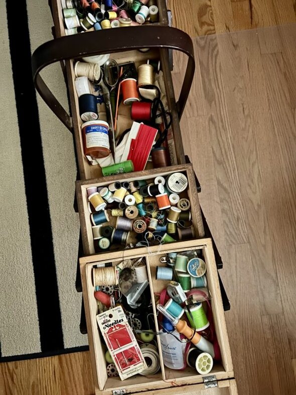 I found the thread for this repair in the sewing caddy from the abandoned house.