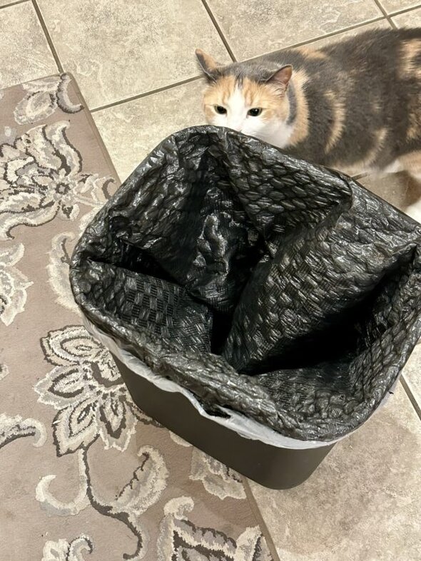 And a final bit of quilt frugality: the quilt came to me in a trash bag, so I put it to use after fixing the quilt. 😉