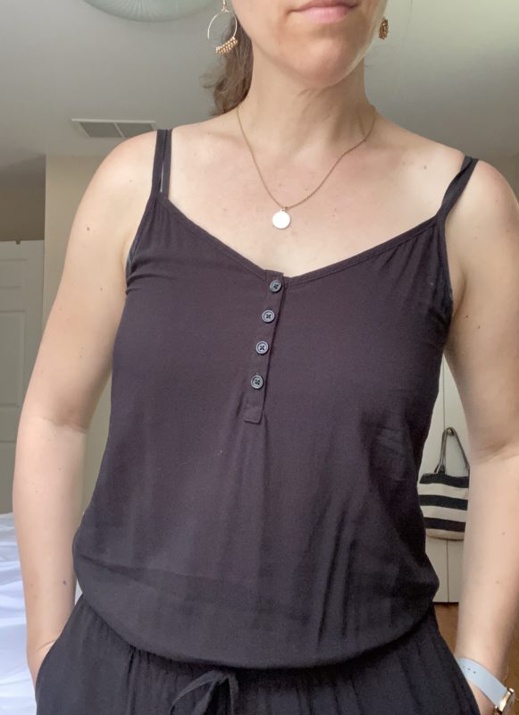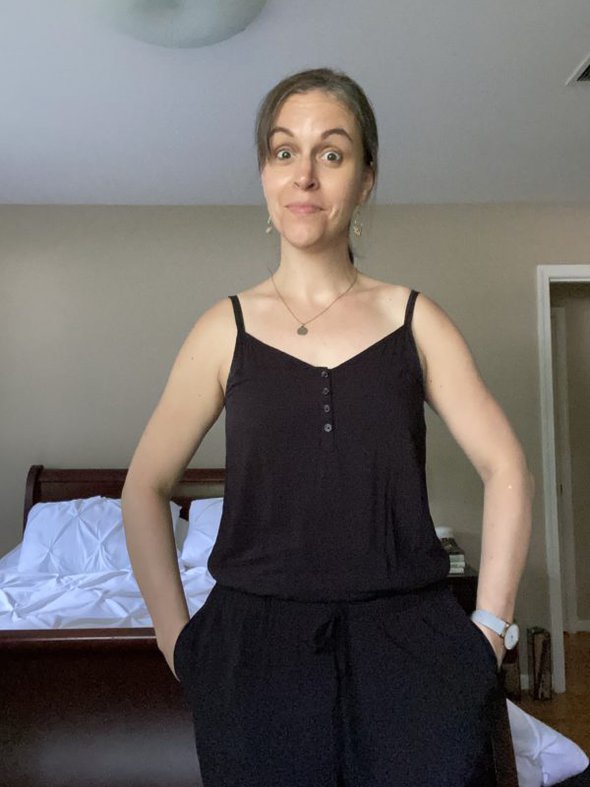 But eBay randomly showed me a $17 Old Navy romper with a blousy top and I thought, “Hmmmmm, maaaaybe that could actually work!” Because the blousy top gives a little wiggle room about where the waist sits.