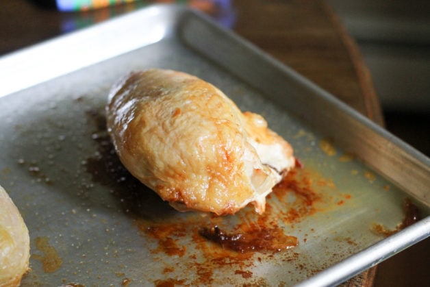 Once the roasted breasts cooled a bit, I deboned them and then threw the bones into a pot. I poured boiling water on the baking sheet to loosen all the browned bits, then dumped it all into the pot and simmered it to make a little batch of chicken broth.