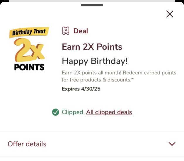 They’re giving me 2x the reward points for my birthday month, so I “clipped” the offer and added it to my account.