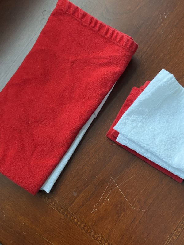 Since I didn’t want to waste the trimmed part of the towels, I hemmed those too and I’ll use them as small napkins or hankies.