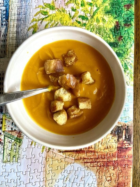 Then I ate ’em on top of a bowl of butternut squash soup (also from my freezer!)