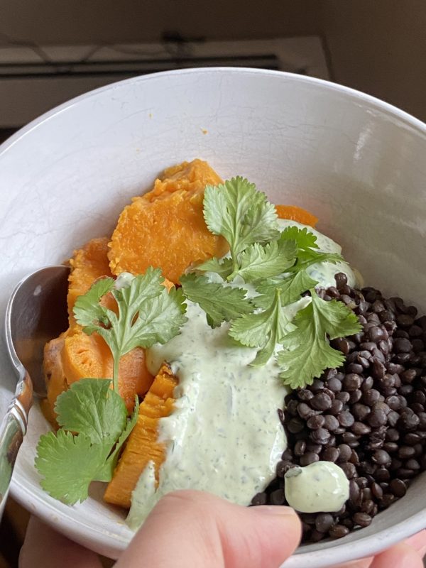 So now I can throw together some simple lunch bowls with the lentils, sweet potatoes, and sauce.