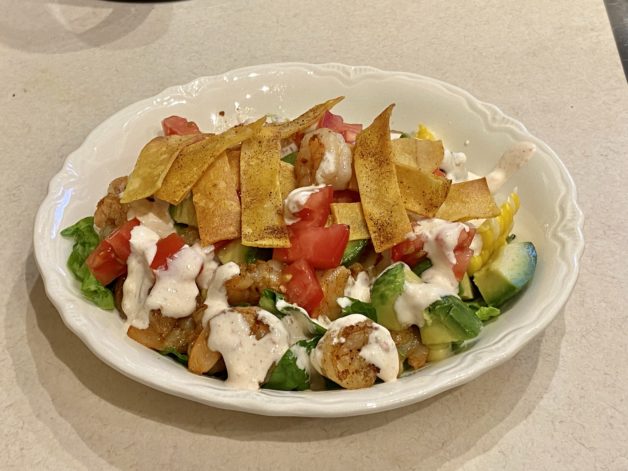 So, I made a shrimp taco salad, and I mixed the sour cream with a little mayo, some milk, and some chipotles (here’s how I keep chipotle peppers handy in my fridge) to make a dressing.