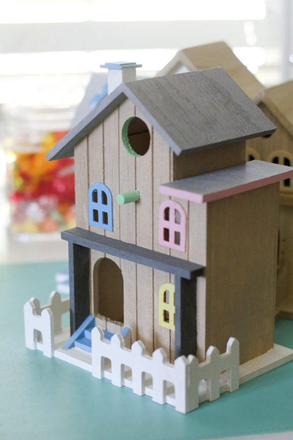 Sonia’s birdhouse is currently living in this huge bookshelf that I rescued and painted white.