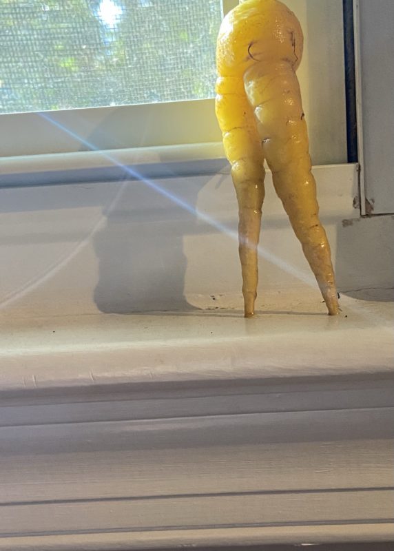 I needed a few carrots for a soup I was making, so I grabbed the ones from the bottom of the veggie drawer. They were a rather random assortment, and some of them were pretty hairy*, but I peeled and sliced them and they worked fine in the soup.