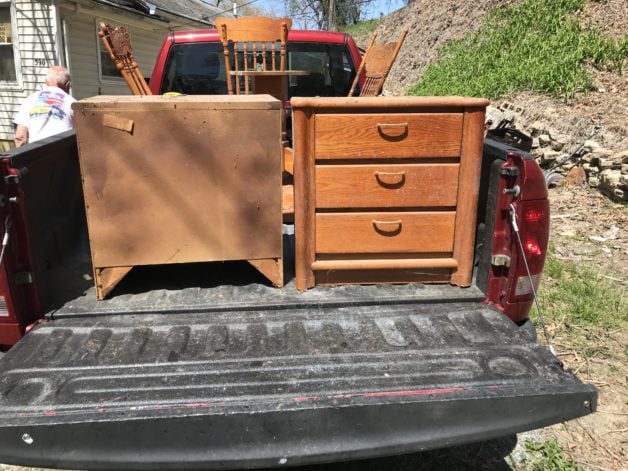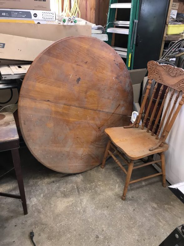 My dad kindly helped me go scavenge a dining table, four chairs, two nightstands, and a small table, and now all of that stuff is in his garage, waiting for me to sand it down.