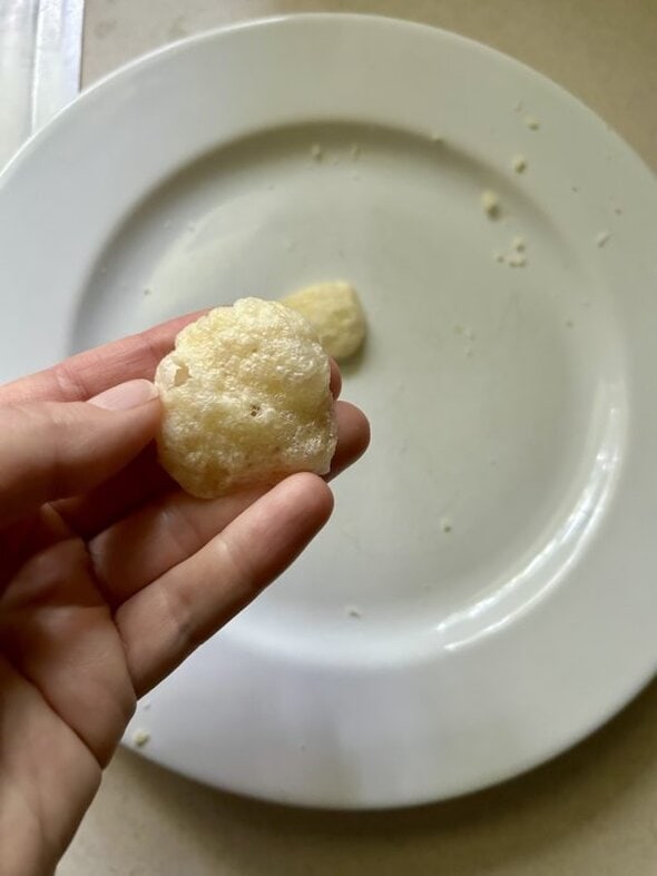 I have found that this works best if you do a thin, even slice. And you have to remove the crisp from the plate before it is fully cooled; otherwise, it will just shatter.