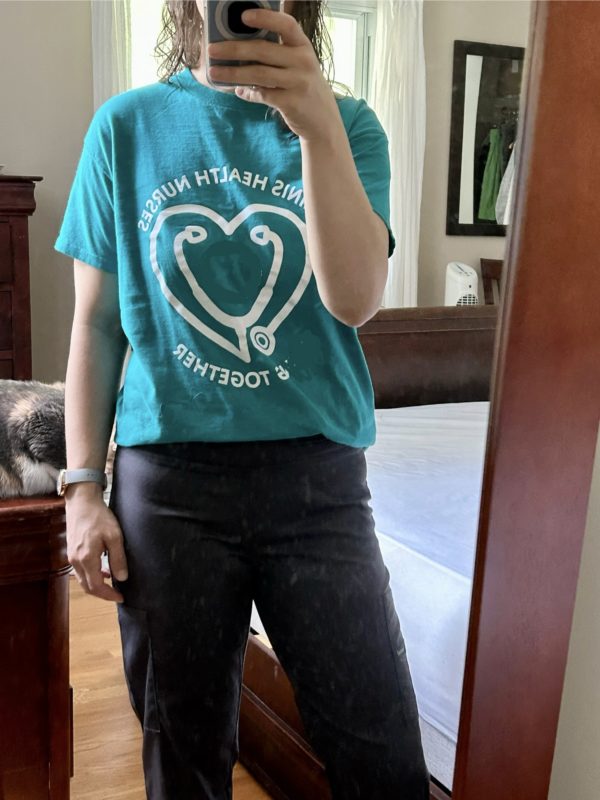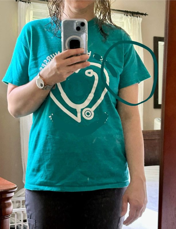 On my unit, we are allowed to wear some t-shirts, like the ones my hospital orders for Nurse’s Week. I got one a little while back and I have never loved it because the sleeves are quite obviously designed for someone with biceps about 3x as large as mine.