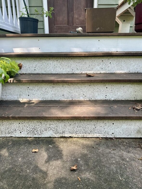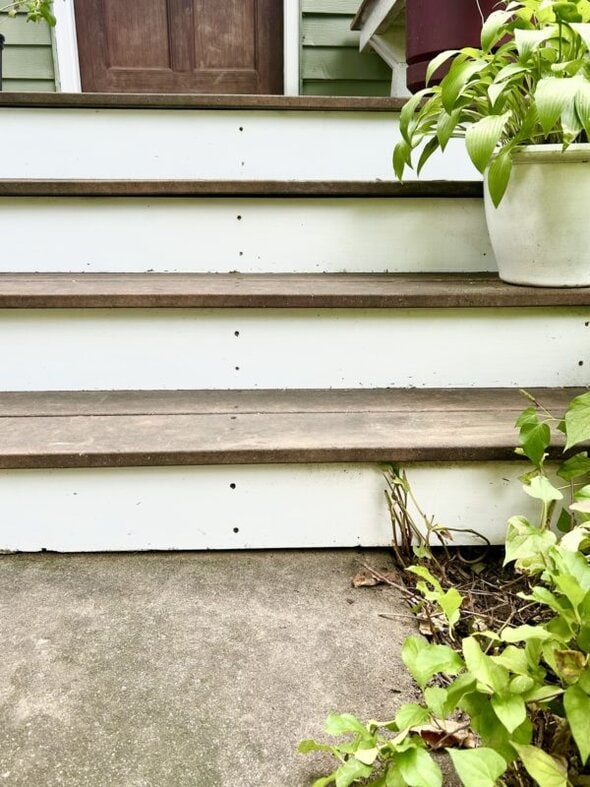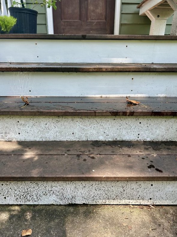 Water? Then I realized you meant HOT water, yes, that works. I use vinegar + water. CHIQUITA is always there, love that. Clean outdoor stair risers, what a good idea.