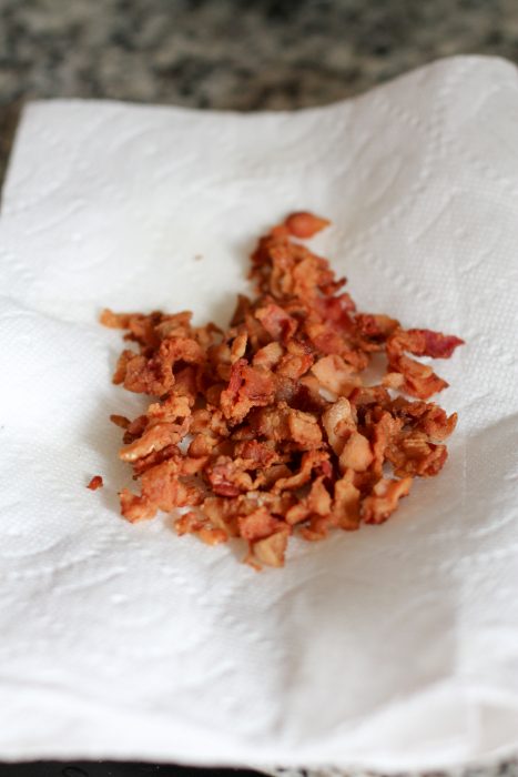 I bought a package of unevenly sliced bacon at Aldi. This particular brand is cheaper because of the wonky slices, and who cares about unevenness if it needs to be chopped for the recipe?