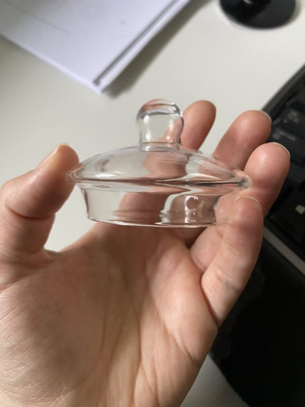 I looked at the size and thought, “Hmm, I wonder if this might fit any of my saved glass jars.” and it did fit very nicely on a saved candle jar.