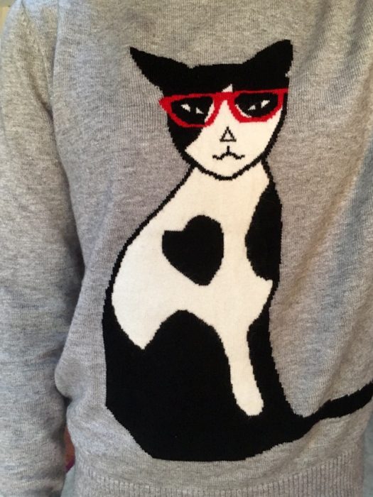 That sweater is amazing. I think I will try to get a little more whimsy back into my wardrobe. I’ve been trying to just wear and rotate what I have to try to lessen my footprint but I will watch out for a fun sweater to add to my wardrobe. The cat even looks like yours!