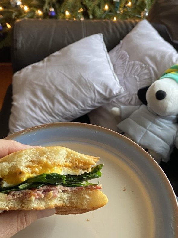 I used a leftover Christmas roll and some leftover ham (plus some sauce and spinach) and while yes, this made only a tiny dent in the ham, every little bit helps. 😉