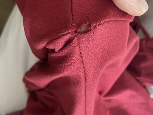 Under the arm is a nice, inconspicuous place to do a repair; it’s way lower stakes than, say, the middle of the bodice.