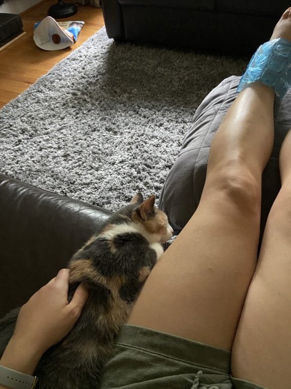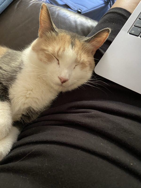 I’m not delighted with my sting situation, but Chiquita has been very pleased about my increased couch time, because now she can snuggle with me more easily.