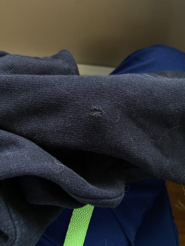 I wear my American Giant joggers out on my walks almost every day when the weather is cold, and they got a few holes in them.