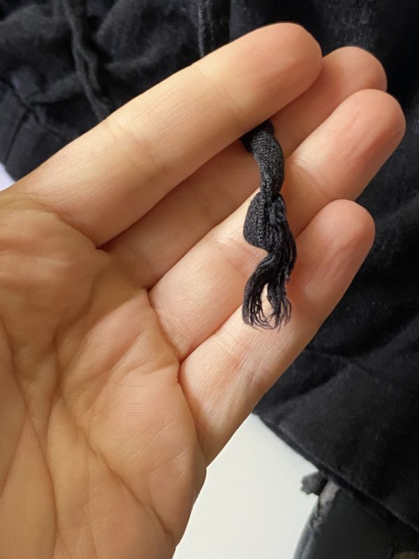 So while I had my black thread out, I did a quick fix by trimming the frayed bits and sewing up the remaining edges by hand.