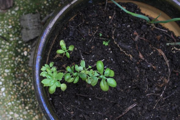 Since it’s warm now, I replanted them in pots (with one basil plant in my front bed) so that they can get healthier.