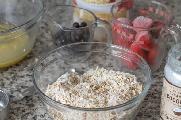 In a second bowl, mix up your dry ingredients (oats, shredded coconut, baking powder, and salt).