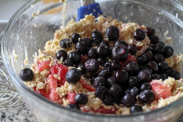 Fair warning: if you use frozen blueberries, your previously pristine oat mixture will become a bit unsightly. If I’m using a combo of fruit, I mix in the other fruit first and then add the blueberries at the very end.
