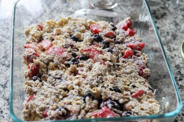 And since the oats sit overnight in the fridge before baking, you can feel free to just stir in frozen fruit, as it will be nicely thawed by morning.