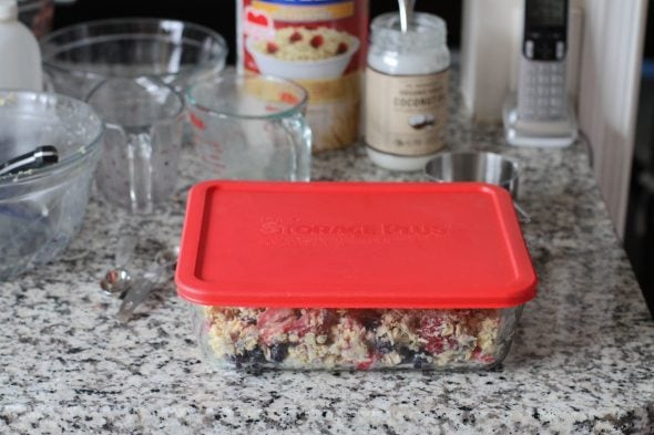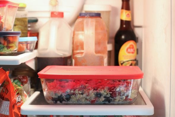 4. Fold in frozen fruit, and transfer mixture to a greased 8×8 inch dish. Cover and refrigerate overnight.
