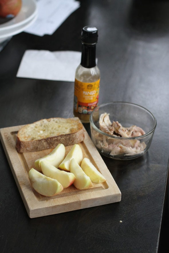 Nothing too creative here; just leftover chicken topped with mango hot sauce, toast from the previous night’s loaf, plus an apple.