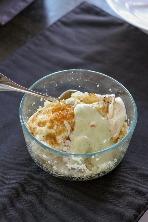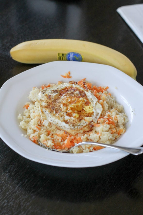We had some leftover couscous, so I heated that up with some shredded carrots, and added two fried eggs.