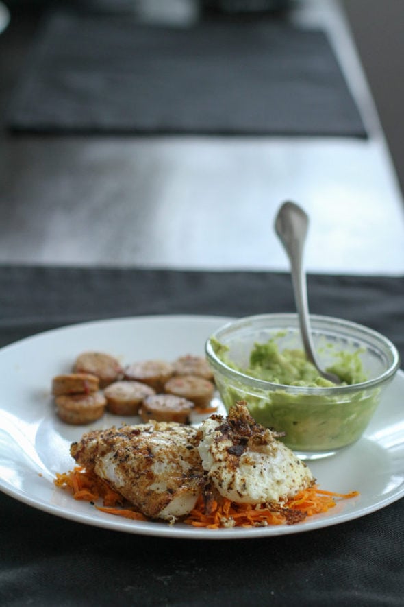 I also browned another one of those clearance-purchased chicken sausages, and made a small bowl of guacamole.