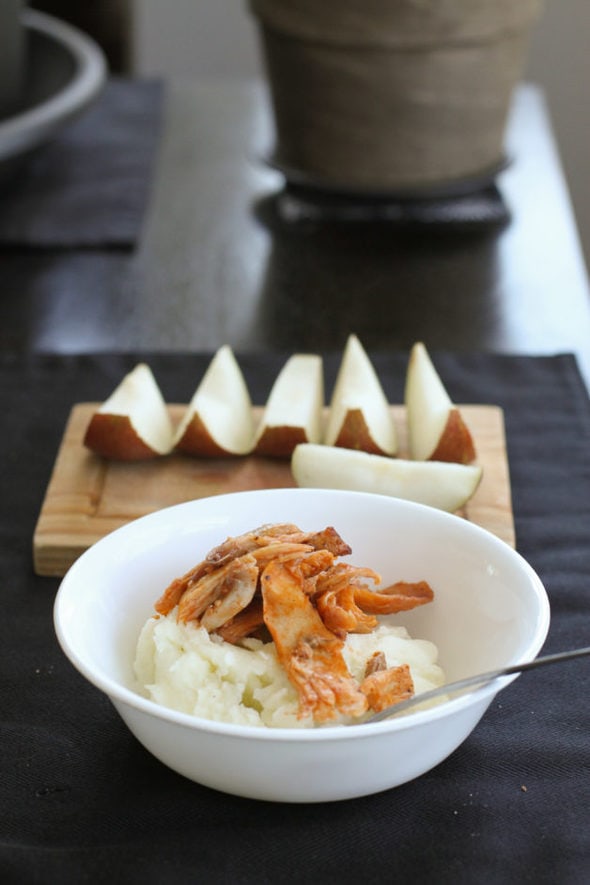 lunch | mashed potatoes + smoked chicken + a pear