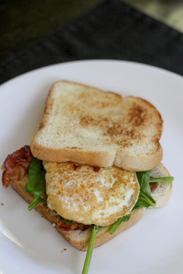 So I had it on toast instead: two eggs, leftover bacon, some spinach, and some chopped hot cherry peppers.