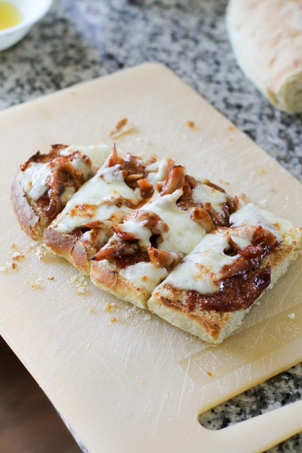 Usually my kids fend for themselves at breakfast and lunch, but when I saw that we had leftover chicken and leftover French bread, I threw together a lunch pizza for Zoe.