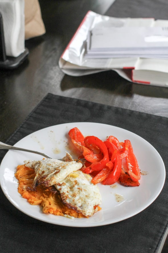 I heated up some leftover roasted potatoes in a skillet, fried two eggs, and put them on top of spinach. Apple on the side. 🙂