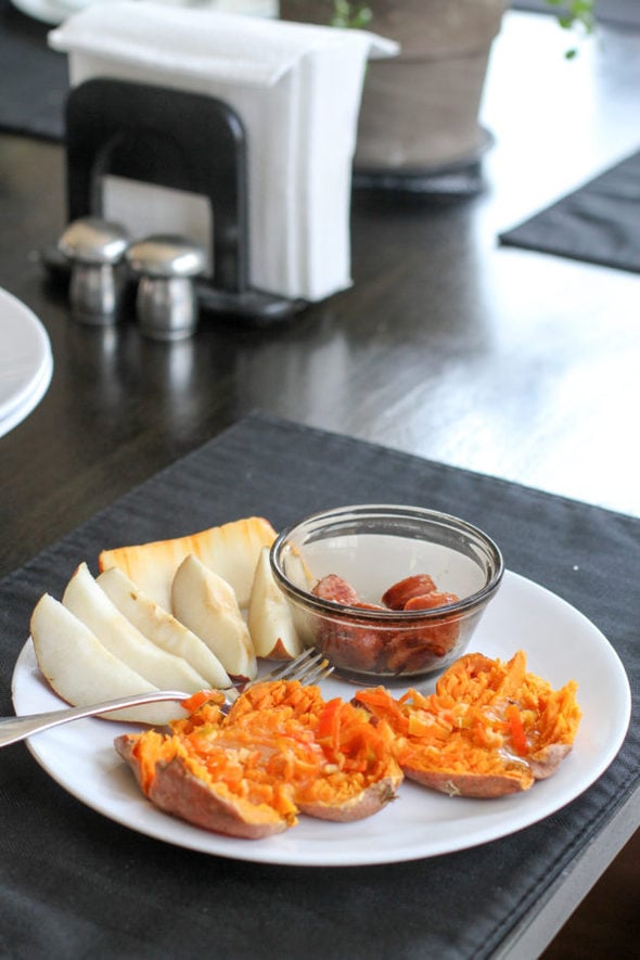 More Hungry Harvest sweet potatoes, plus some leftover chicken sausage, a Hungry Harvest pear, and the last slice of Muenster cheese.