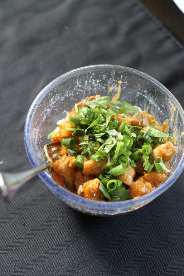 I’d grilled chicken for chicken spiedie subs, but I had some pieces of chicken that were too small to put on the skewers. So, I put them in a container in the fridge, and the next day at lunch I cooked them.
