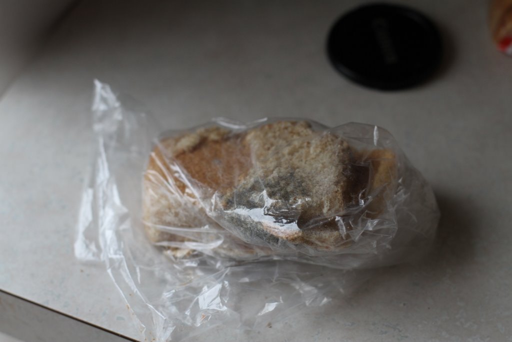 These ends of a loaf of bread went moldy mostly because we had more fun and interesting breads around. Who wants to eat whole wheat bread when you can have a squash roll topped with cinnamon and sugar??