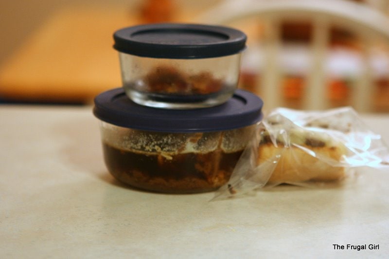 Anyhoo, we have here a bit of bacon, half of a Beef Au Jus sandwich, and some cooked beef in broth (the fixings for Beef Au Jus sandwiches). The sandwich would probably not have been great left over, and there are only a few small pieces of bacon, but I’m really irritated with myself over wasting the beef, because beef isn’t exactly cheap.