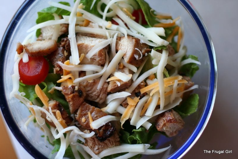 We’d had tacos the night before, so I had leftover lettuce, tomatoes, and shredded cheese. I combined this with some marinated, grilled chicken from a previous night, and the result was quite delicious, and very unlike taco leftovers.