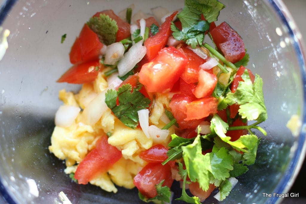 Happily, scrambled eggs are a great way to use up little bits of food that are left over. One day this week I used half a bratwurst, part of a potato, some leftover sliced onions and peppers, and some baby spinach in my eggs, and another day, I used some about-to-go-bad tomatoes and cilantro to make a fresh salsa to go on top of my eggs.