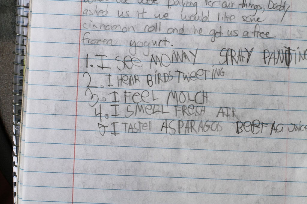 For these, we go through the five senses and tell about each one, thinking about what we’re currently seeing, hearing, touching, and so on.