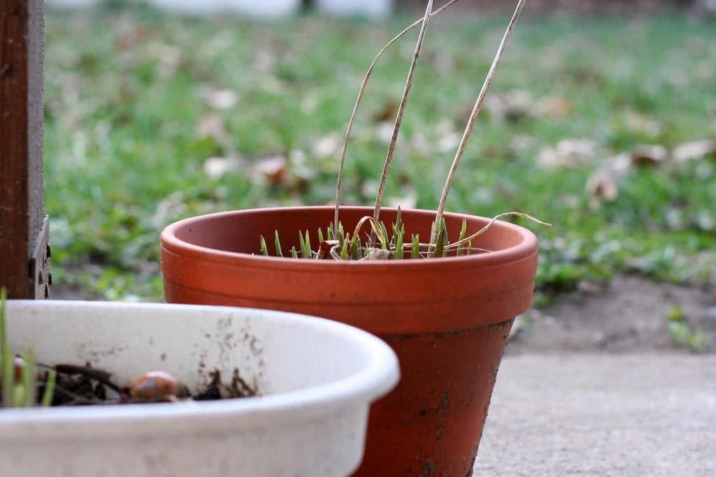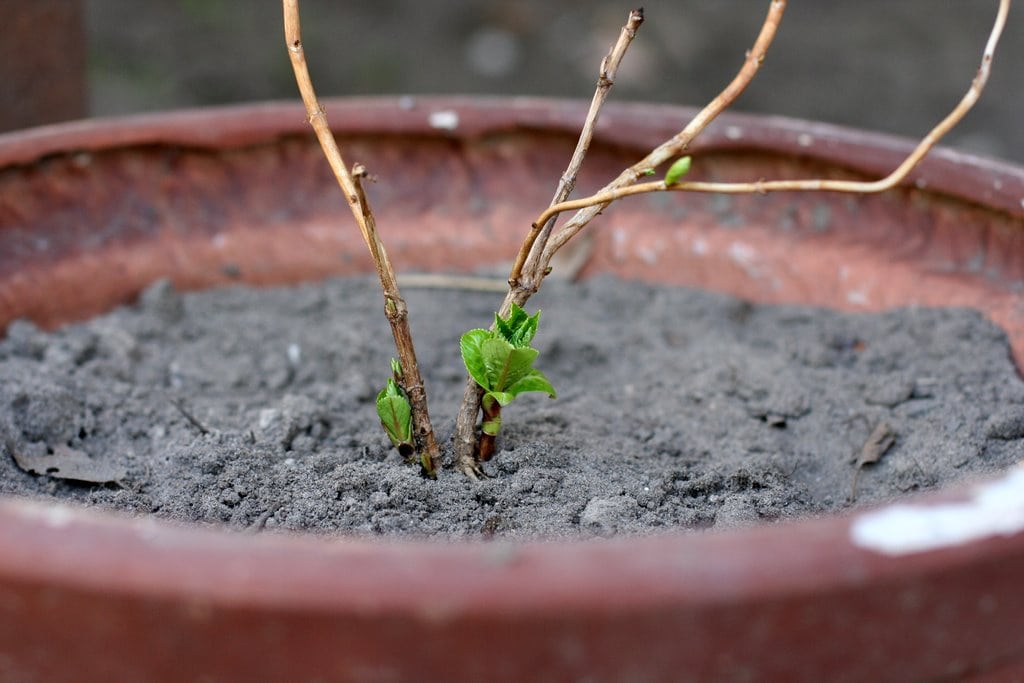 And finally, this is my hydrangea from Aldi (you may remember it from my post on frugal, patient gardening). I just promoted it to a big ol’ pot, which I bought at Goodwill. I was SO tickled to see it because I’ve been watching for a large pot for months. I hope that the hydrangea will do some major growing this year in the new pot. I mixed some compost in with the soil in the pot and I figure that should make for a happy plant (some of the SunChips strips are in this pot, actually!).