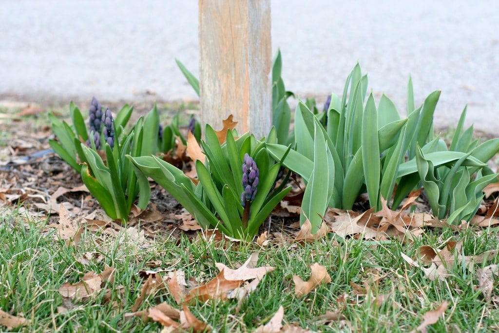 My hyacinths are getting awfully close to blooming. These were growing in random places in our yard when we bought the house, so I dug them up and planted them around the mailbox. They seem to be quite happy there.