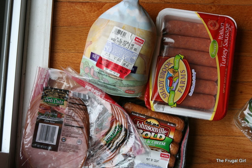 Our meat. The chicken is for future use (it was on sale) and so are the bratwurst (they were in the reduced bin, as they expire soon. No biggie to me, as they’ll go into the freezer).
