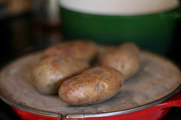 First, you’ll need to bake 4 russet potatoes. You can do this in the microwave, but by the time you microwave 4 russet potatoes, the microwave is not a particularly large time-saver. Plus, if you’re baking bread the same day, it’s not like the oven heat goes to waste.