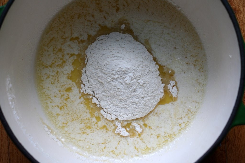 On to the soup base! Melt the butter in a large pot, and stir in the flour. Stir and cook the flour/butter mixture for 1 minute.