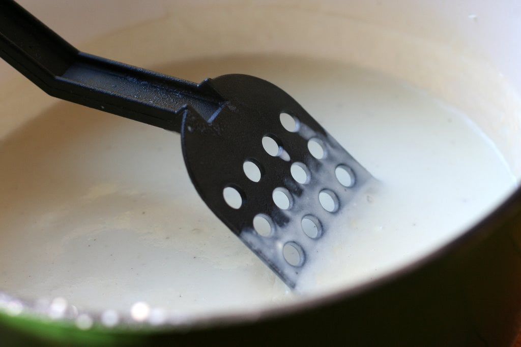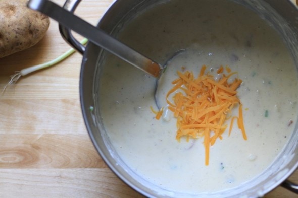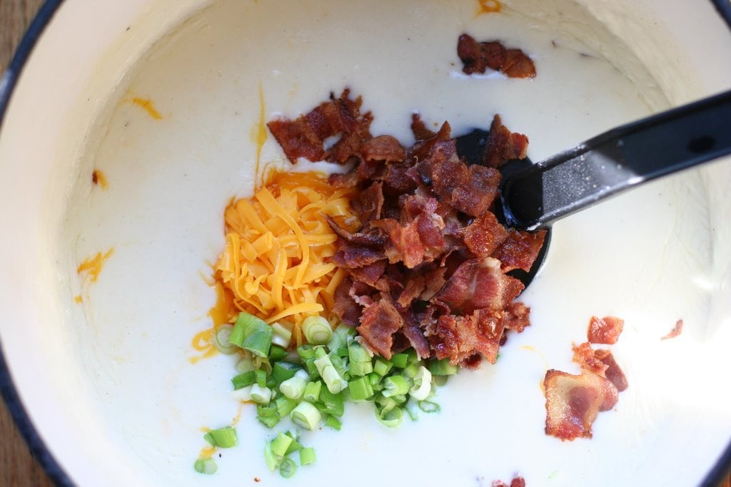 Once the milk mixture has boiled for a minute, stir in the cheese, bacon, green onions, and potato pulp.